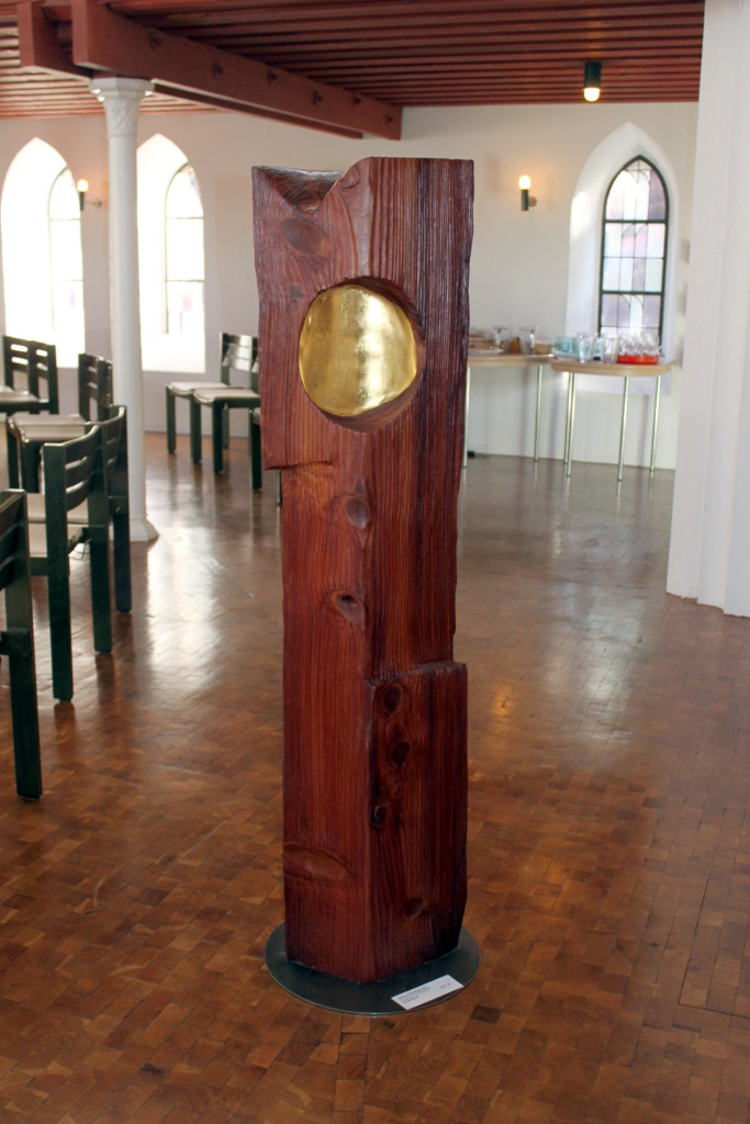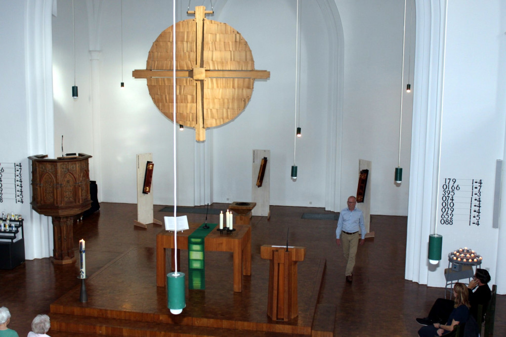 Der Künstler und Holzgestalter Bernhard Schmid setzte seine kinetischen Objekte im Chorraum selbst in Bewegung. Die drei Werke aus Mammutbaumholz tragen Gedanken und Werte in goldener Schrift gefasst auf der Oberfläche und erzeugen durch Zapfen im Innern Klänge. Noch zwei Wochen können alle, die die Kirche besuche, Kunst nicht nur theoretisch erfassen, sondern sie bewegen und sich selbst bewegen lassen, sie mit allen Sinnen erfahren. Weitere Werke finden Sie in der ganzen Kirche.