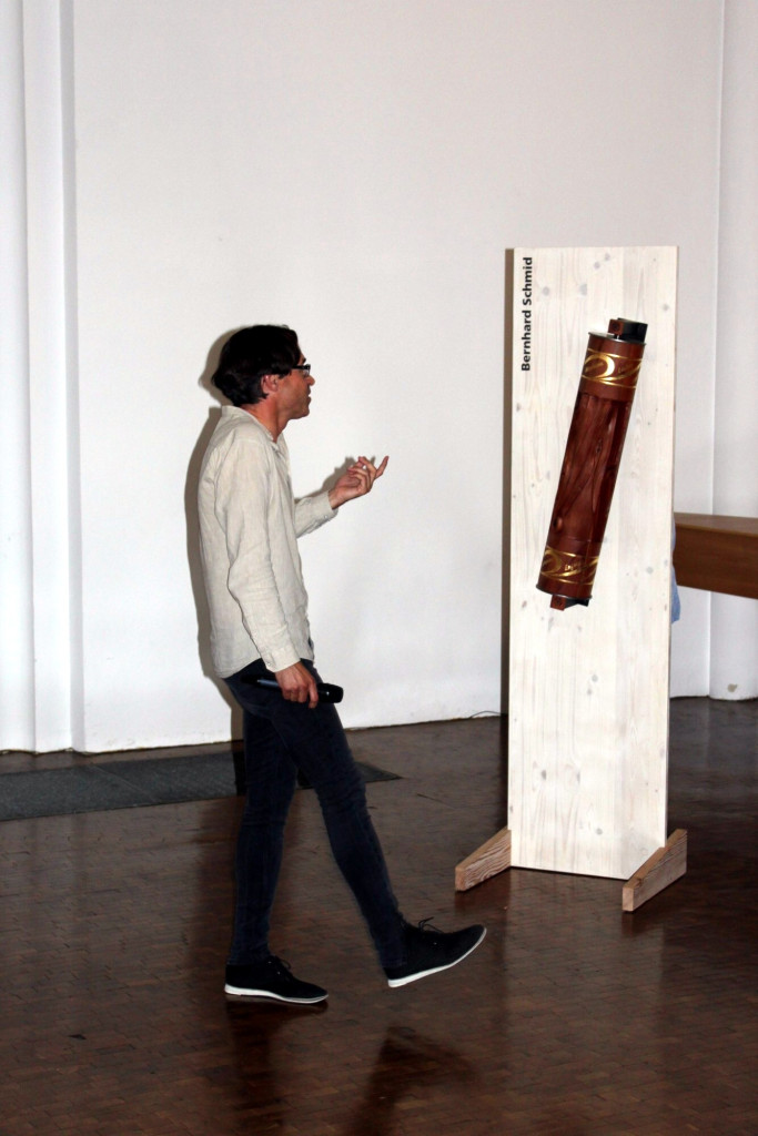 Pfarrer Barraud machte die Anwesenden mit der Kunst vertraut, nachdem Bernhard Schmid seinen Werdegang geschildert hatte. Schmid, der schon früh einen Bezug zum Schreinerhandwerk fand, erlernte den Beruf mit seinen technischen Grundlagen, fühlte sich aber immer mehr zum Werkstoff Holz hingezogen und fand einen spirituellen Zugang zum Baum. Daher trifft für ihn die Bezeichnung Künstler und Holzgestalter in besonderer Weise zu.