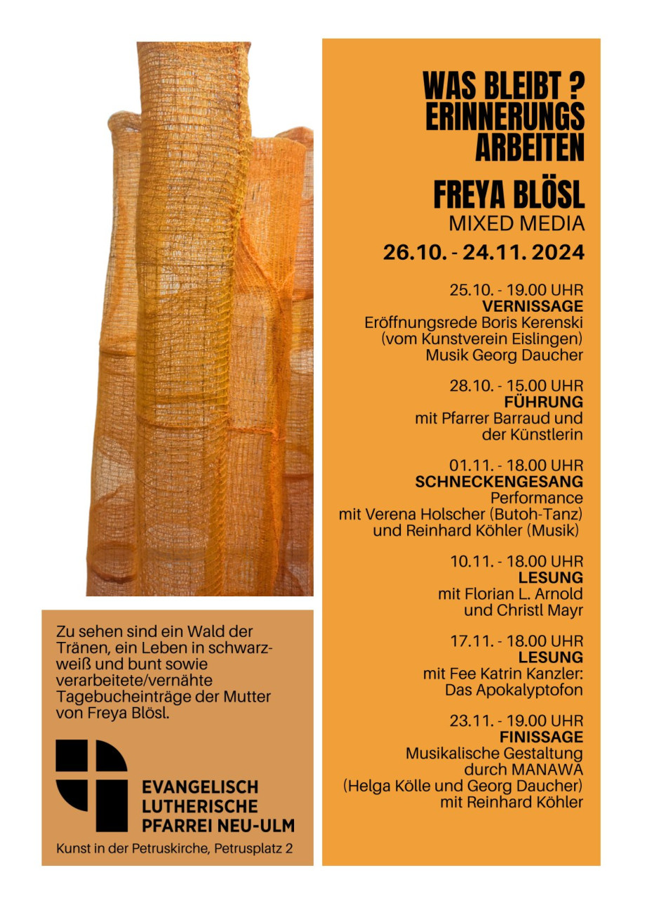 Am 25. Oktober gab es wieder einmal eine Vernissage in der Petruskirche. Für die neue Ausstellung unter dem Titel „Was bleibt? Erinnerungsarbeiten“ hat die bei Ulm wohnende Künstlerin Freya Blösl Dinge aus ihrer eigenen Vergangenheit aufgearbeitet.