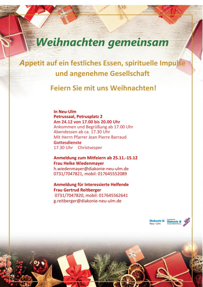 Auch in diesem Jahr veranstalten die Diakonie Neu-Ulm und die Evang.-Luth. Pfarrei Neu-Ulm am 24.12 wieder eine gemeinsame Weihnachtsfeier.